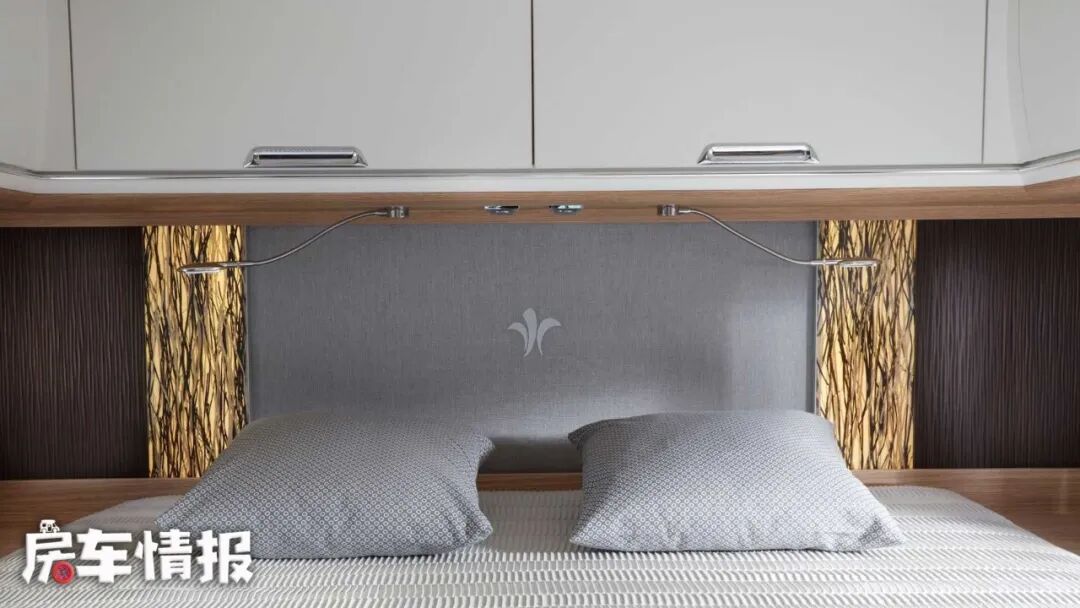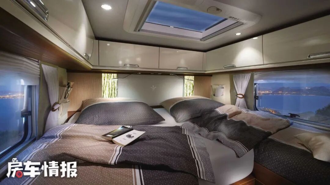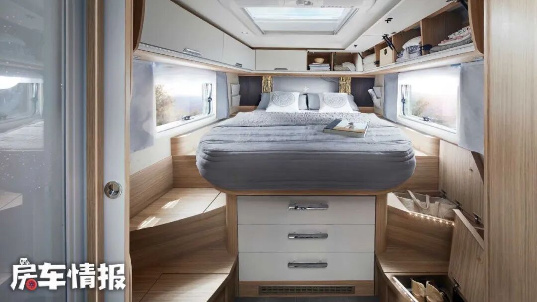 车尾就是独立卧室区了,带有推拉门,拉上以后与前方完全分隔开,内部是一张双人大床,上方都是储物空间,左右环窗上方还有天窗,通透性和采光都不错,床铺位置较高,左右和设计了楼梯便于上下,同时楼梯下方也能储物,在加上床铺下方的抽屉总体来说可以放置不少行李物品。