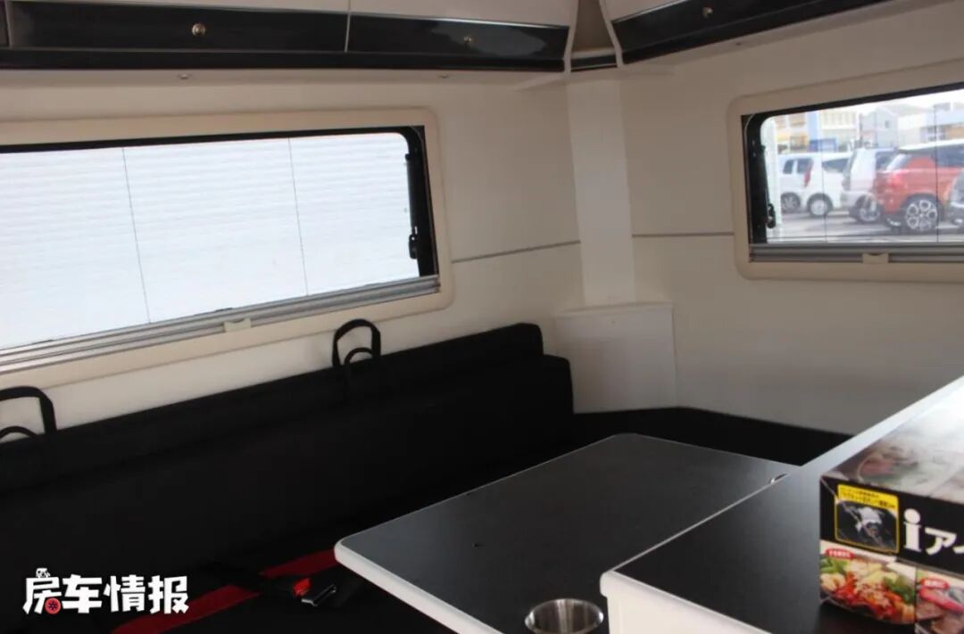 进入生活区,受限于整车尺寸,内部的空间也不是很大, 基本上一眼就能看到全部,属于那种把所有家具和功能区,一股脑全都放进一个箱子的设计,比较简单明了,另外车内没有提供独立卫生间,如果想要如厕方便的话,可以自备一个户外淋浴间以及便携式马桶。