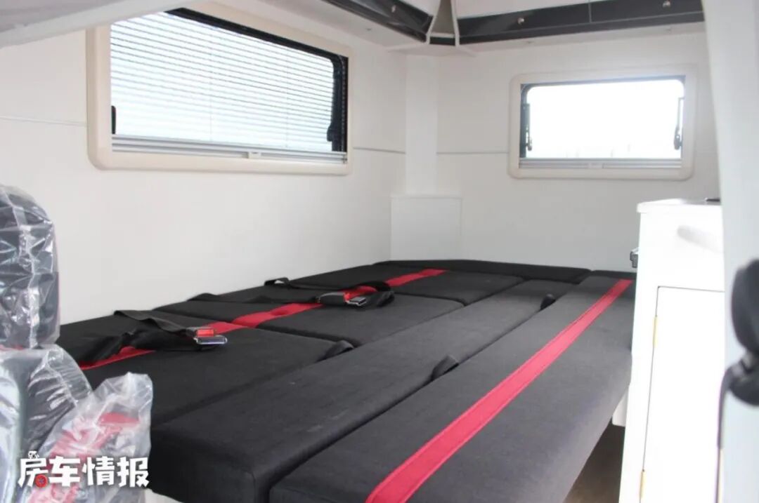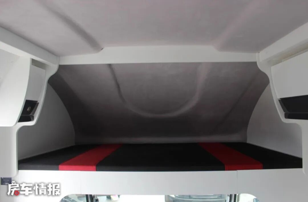 虽然空间不大,但是这款车内部却提供了两张床铺,可以满足两大两小四口人居住,第一张床就是位于驾驶室顶部的额头床,尺寸并不是很大,但睡下一大一小问题不大。