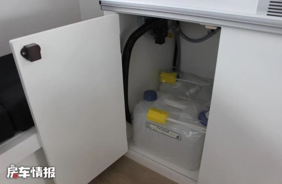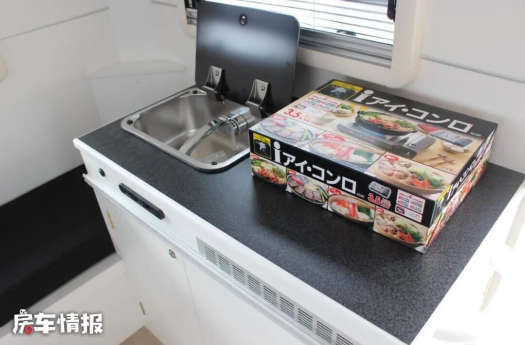 车厢内提供了一组橱柜,整个橱柜尺寸不小,操作台面上提供了一个洗菜池,日常做饭的话可以自备一台便携式卡式炉,橱柜下方提供了多个储物柜,能够用来收纳物品。