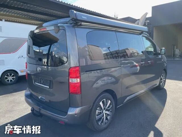 这是一款基于丰田MPV车型ProaceVerso底盘进行改装的升顶式露营车。银灰色的外观看上去更加沉稳大气。整车尺寸长4950mm,宽1920mm,高1990mm,小巧的车身具有很好的通过性能。不足2m的车高,下地库也是非常容易的。