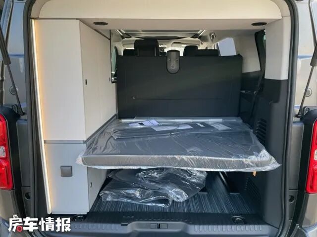 打开尾门后可以看到,车尾部主要配置了一张固定的小床铺,座椅放倒后,尺寸可以延长,满足乘客的休息需求。下方则是大尺寸开放式的储物仓,可以在这里放置一些户外露营用品或行车工具。旁边则是多个储物柜,可以放置一些方便拿取的小物品。