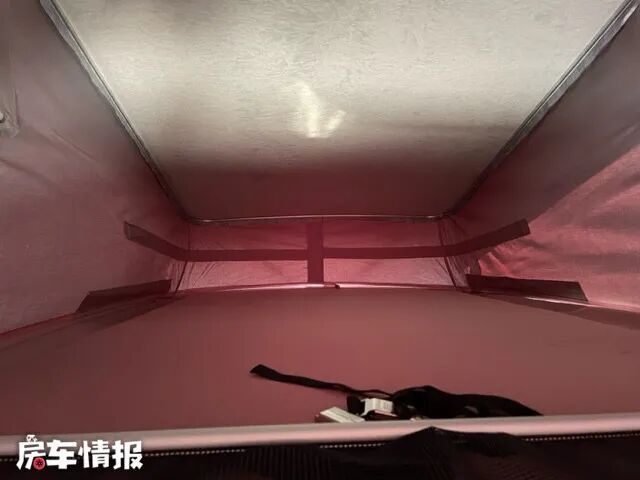 车顶升起后可以得到一个尺寸尚可的床铺,虽然尺寸不大,但满足一个成年人还是绰绰有余的。不足之处是升顶机构的保温隔热做的不够好,在夏季和冬季是不建议在车顶休息的。