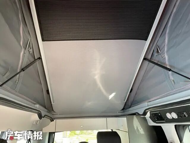 由于车顶采用升顶式设计,因此车顶内部并未做过多的配置,在两边做了氛围灯带,可以很好的为车辆增加内部的照明。