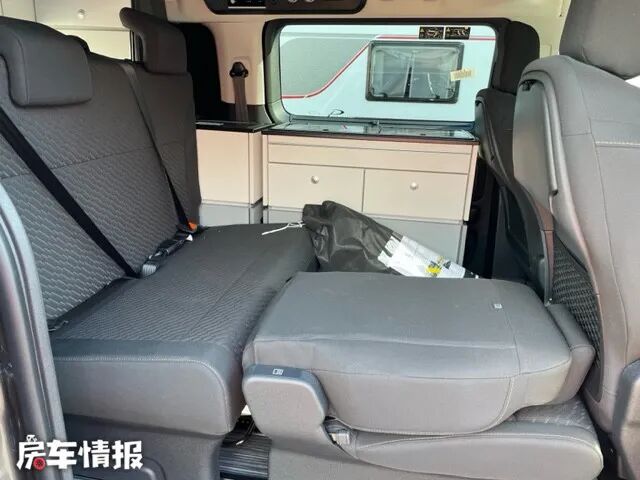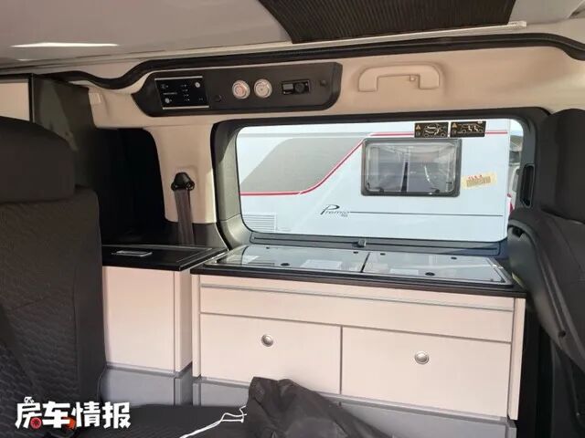打开中门后可以看到,会客厅采用单排双人座椅的配置,同时配有三点式安全带,满足乘客的乘坐需求。前方还配置了一个可移动拆卸的座椅,放倒后也可以拼成一个小床铺,让乘客临时休息。会客厅的内侧则是厨房的吧台区了,主要配置了翻盖式水槽、电磁炉、洗脸盆等配置。下方则是储物抽拉柜,可以放置一些茶叶或生活用品。