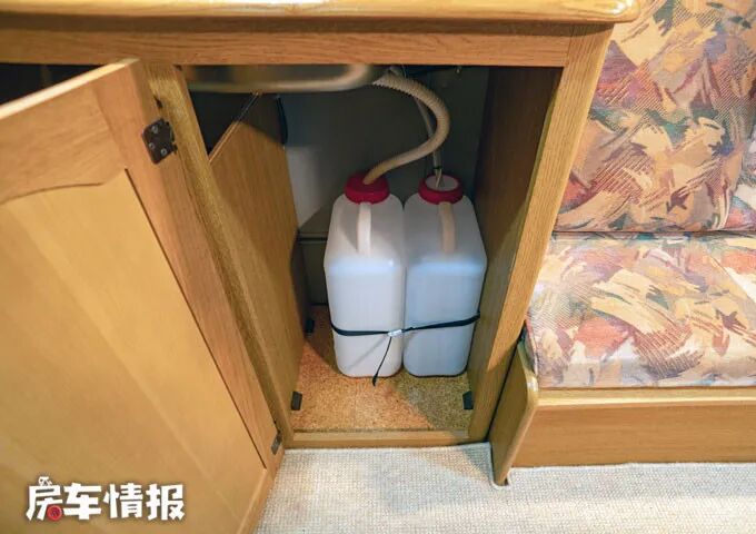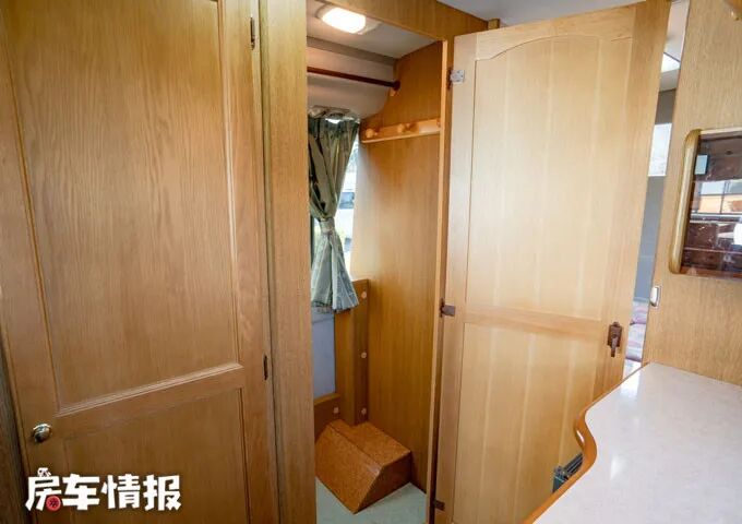 在厨房对侧其实是一个储物柜+淋浴间(或者更衣室)的位置,一般国外的房车停在营地较多,营地里上厕所和洗澡都比较方便,所以车内对卫生间的需求并不高。