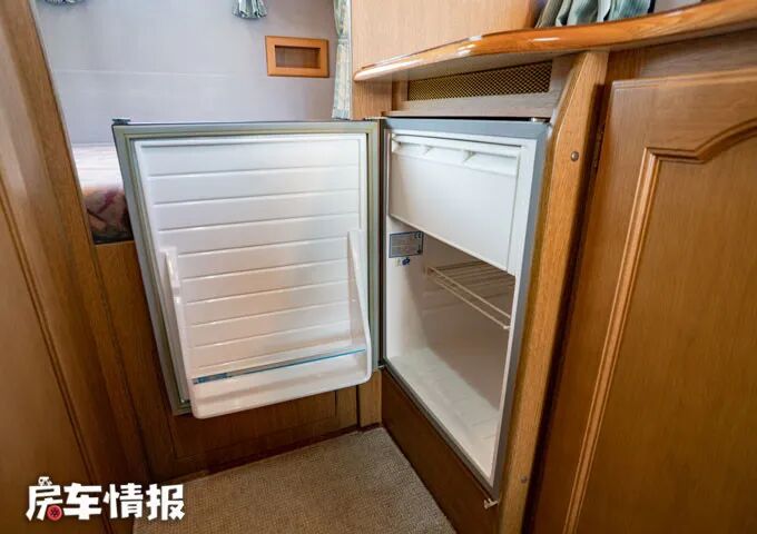 在整个会客区后方就是厨卫和休息区了,厨房配有洗菜盆和一台65L直流冰箱,车内自带20L的小水箱,可以在这个位置制作一些无烟简餐,增加露营的乐趣。