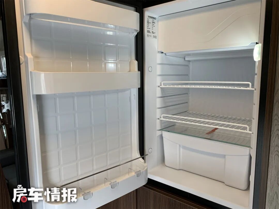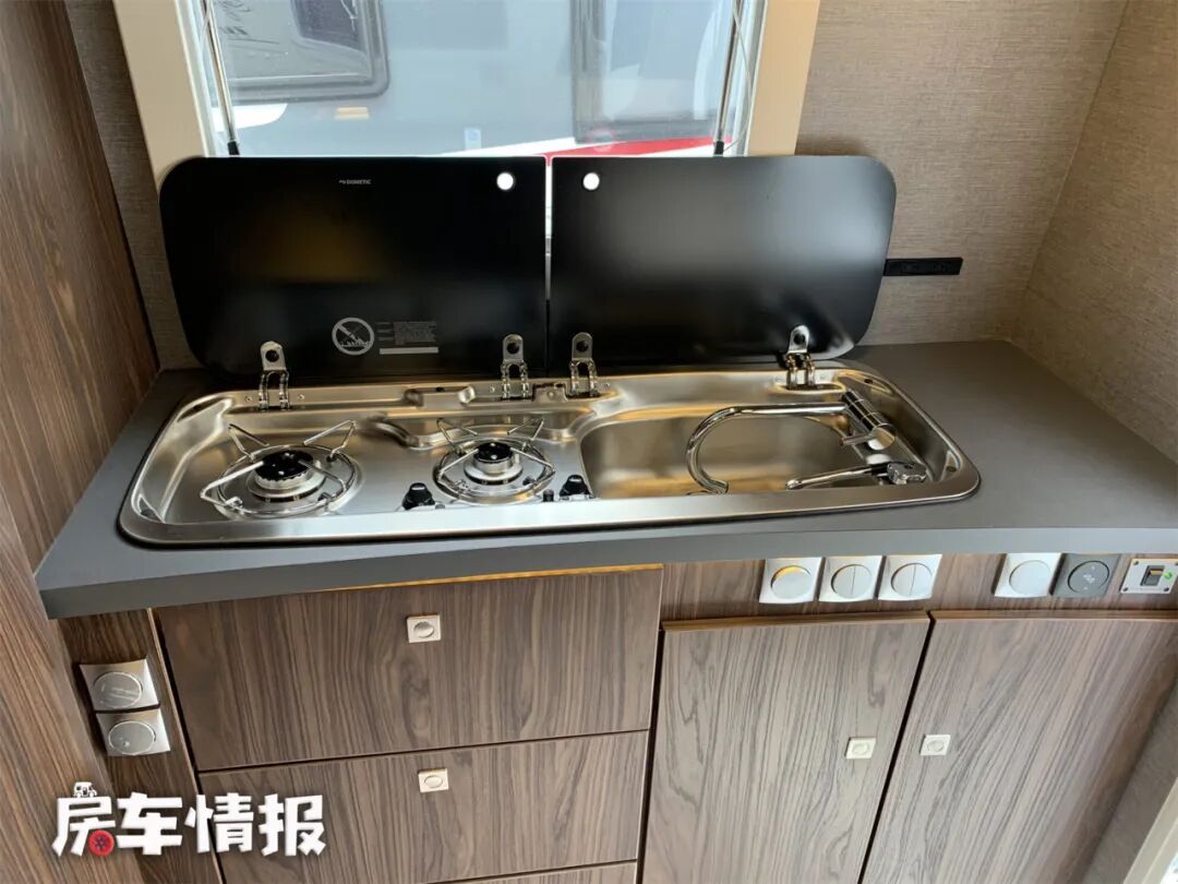一进门右手边是厨房区域,灶台区域简洁实用,两个盖饭分别是双眼燃气灶和带折叠水龙头的隐藏式洗手池,下方有多个橱柜和抽屉可以分门别类放置厨房用品。操作台侧面集中安装了多个灯光按钮,方便、快捷。门口正对着位置,单开门的50L冰箱安装在此,而且在柜子上面略高的位置。这一点与国内冰箱都会被安装再接近地面的位置不同,较高位置的温度和湿度可能更适合冰箱工作,更方便取放东西。下面的双开门衣柜,可以足足放满一家人的应季衣物了。