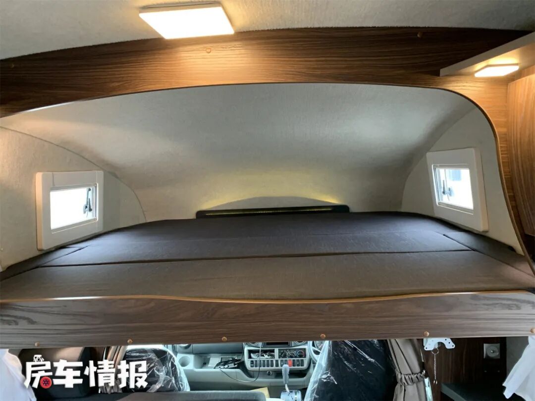 车头部分的额头床是一张可以翻折的双人大床,额头两侧还留有通风窗,到了晚上陪孩子看星星,正好用得上。这台房车一共有两个大床,额头床和会客区沙发拼床,使用起来非常自由,如果是青少年或者喜欢清静者,二层的额头床就是你的乐园。如果喜欢宽敞,方便,卡座区大通铺就是你的菜。
