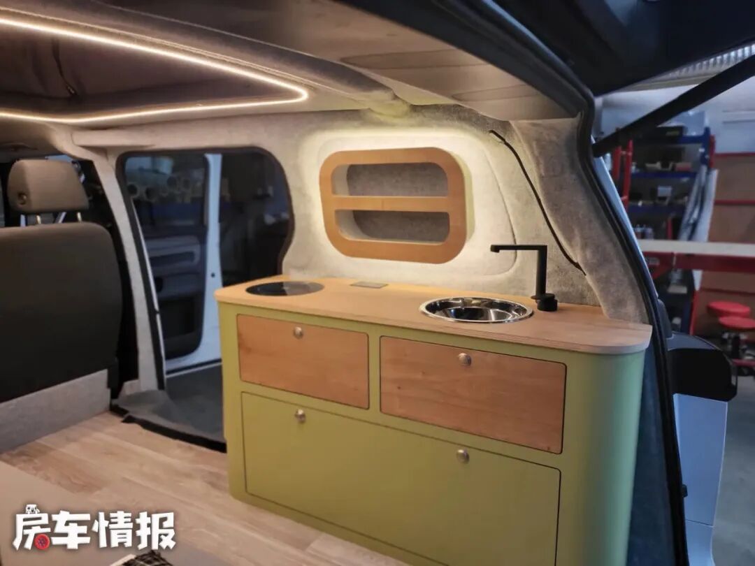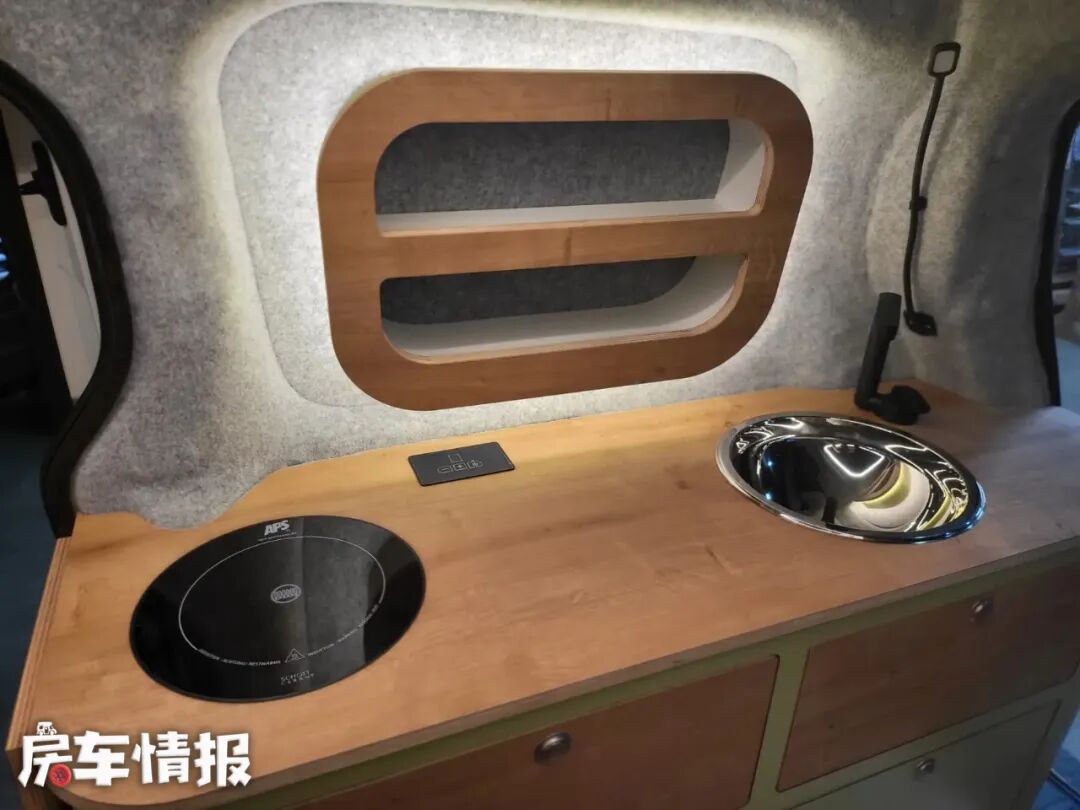 零一侧是车内的厨房区域,尽管车身自带了82都电池,但厨房的能源依然以液化气为主,这和海外房车使用习惯有着一定关系,厨房操作台的尺寸挺大,且提供了数量挺多的储物抽屉,对于日常使用来说,完全没问题。