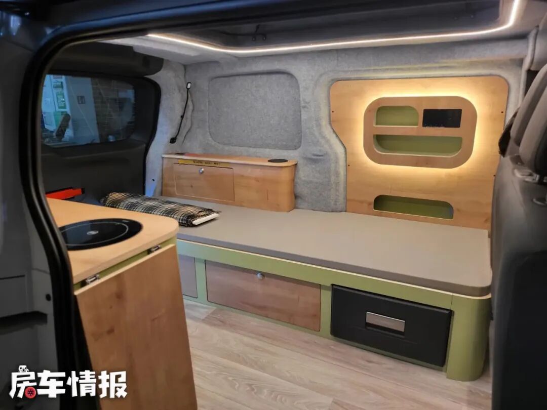 位于沙发下方则提供了一些储物抽屉以及一部抽屉式车载冰箱,可以存储部分旅行中的物品或者食材。