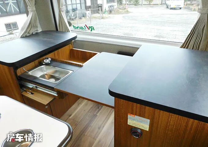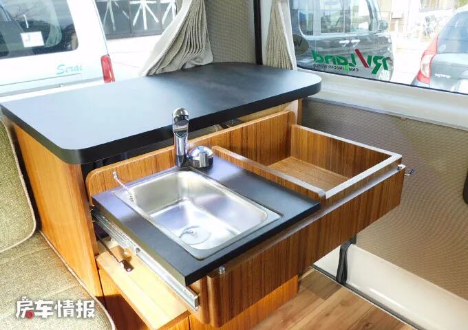 厨房的洗菜池被隐藏在橱柜之中,使用的时候拉出即可,位于橱柜下方还提供了拓展台面、淋浴花洒以及一个可临时充当板凳的折叠脚踏,使用起来比较方便。