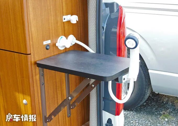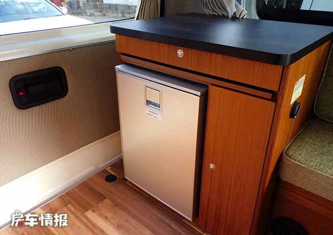 车尾部分就是车内的一个简易厨房区域,这里提供了一台49升的房车专用冰箱,以及10升清水箱和10升灰水箱,以及一个尺寸挺不错的操作台,后期可以自备一台卡式炉,打开尾门就可以在这里做饭。