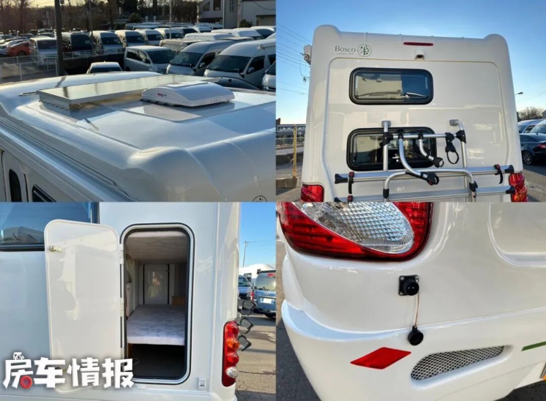 这款房车在车顶安装有太阳能板,车尾还配有自行车架,同时车辆后方还有贯通式储物仓,可以保证旅行中大件行李物品的存放。