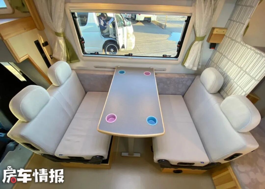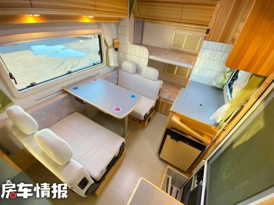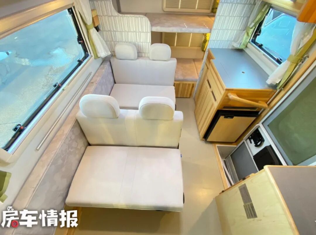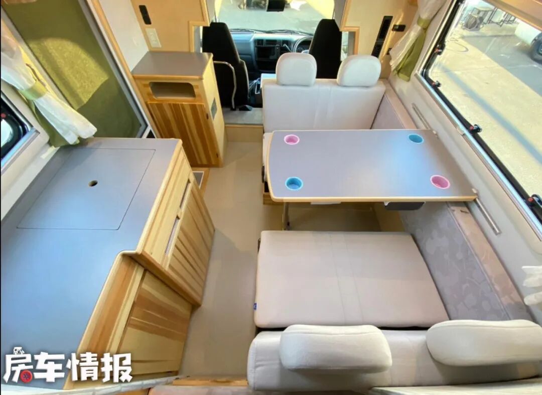 驾驶室与后车厢是贯通的,可以直接从驾驶室进入车型,这款车总共核载6人,在内部还可以满足4人同时乘坐的需求。客厅包含有四人对卡座还有厨房区域。