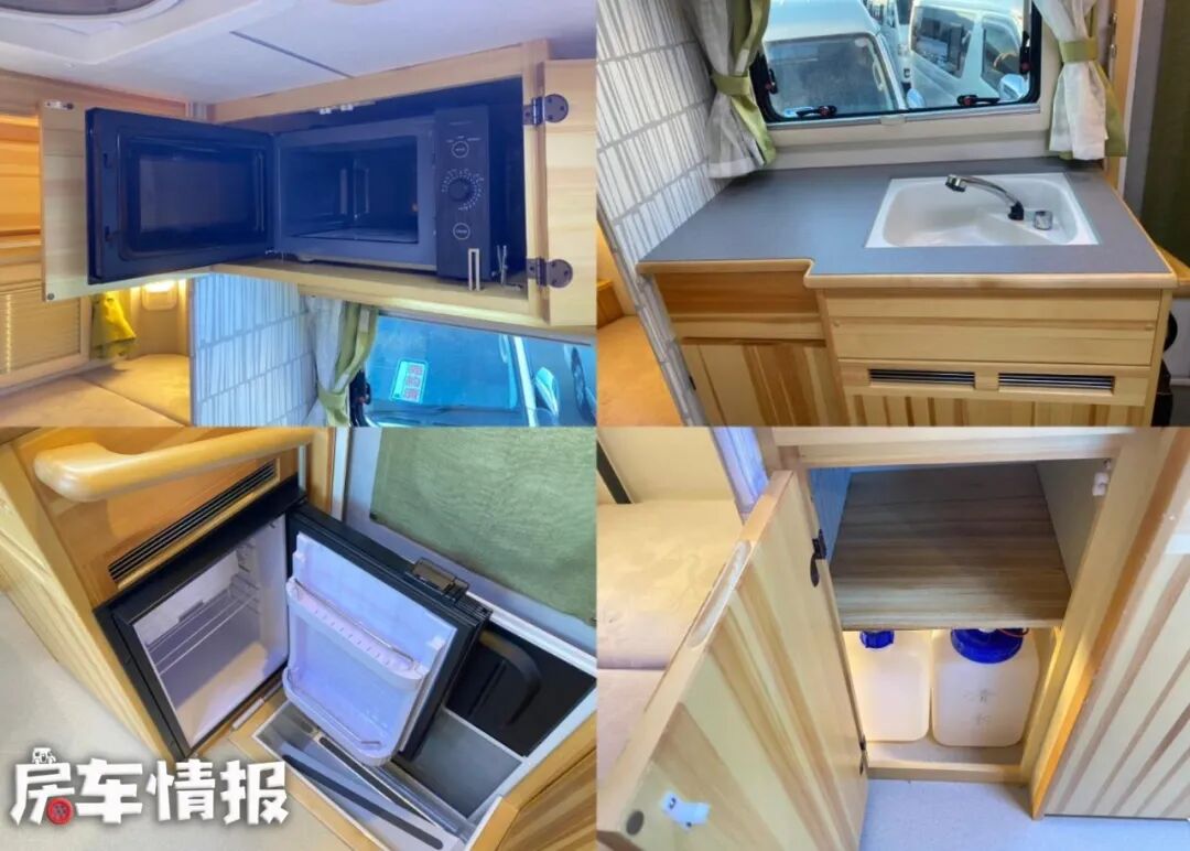 厨房配有微波炉、洗菜池、房车专用冰箱,以及两个便携式水箱保证日常的使用需求。