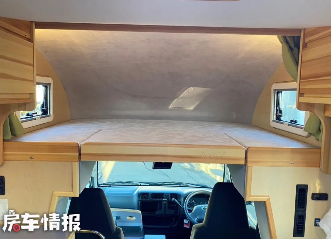 除了客厅以及车尾的三张床铺以外,在驾驶室上方还有一张双人床铺,左右两侧配有外推窗,可以保最多两个人休息使用。不使用的时候把床铺翻折起来下方还隐藏有一台液晶电视可供后方乘客观看。