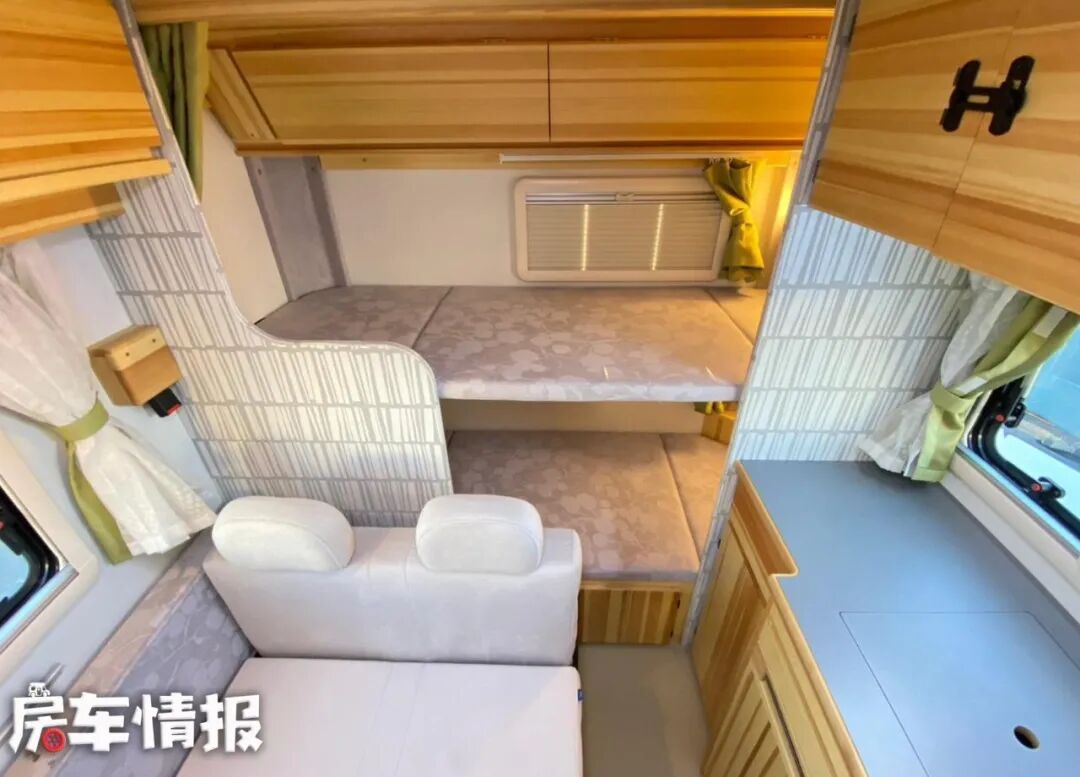 在客厅后方就是车内主卧室的休息区,采用上下铺的行驶满足两人的休息需求,同时上方还配有储物空间便于放置衣物。