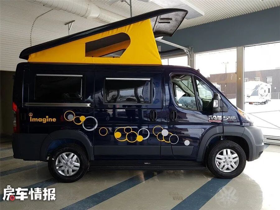与Illusion Hybrid相比,尽管 Imagine比Illusion Hybrid车型要短些,保险杠之间的距离为4950mm。它的宽度为2080mm,但由于带有1220 x 1830mm标准顶棚,并带有可转换电源的原因,在这个尺寸下的imagine可以容纳更大的睡眠空间,1370 x 1880mm的床可供四人休息。更大的内部空间使其后排座椅带有沙发式扶手,双旋转驾驶室座椅,并且配备了微波炉,双芯燃气灶和70升冰箱的设备齐全的厨房,显得更加有家居感。后部添置了户外淋浴间和有线电视连接器。配备3.6升V6发动机,最大功率可达209kW。这款带有ProMaster,Uconnect信息娱乐系统和后视摄像头的imagine起价为92,900加元(约为55.2万元)。