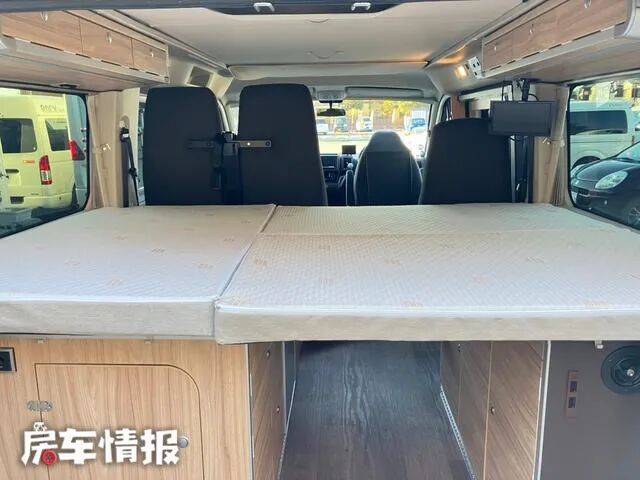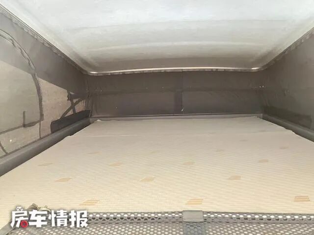 到了夜晚需要休息的时候,除了顶部弹出车顶内部的双人床,车尾部也可以拼成一张横置双人床,满足两人休息没有问题。