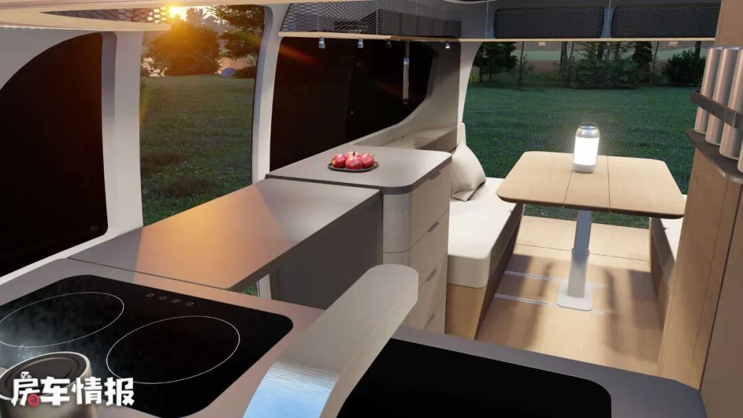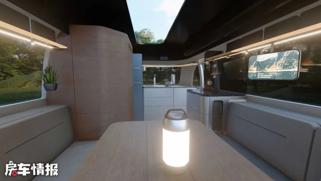 生活区的设计相对来说就要常规一些,并且受限于车身尺寸内部空间并不是很大,从渲染图可以看到生活区提供了一个全尺寸厨房和一组四人对卡座休息区,当驻车以后,将尾门打开,可以坐在沙发上观看外部美景。