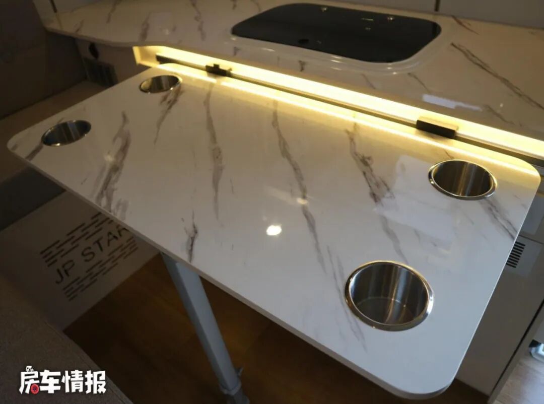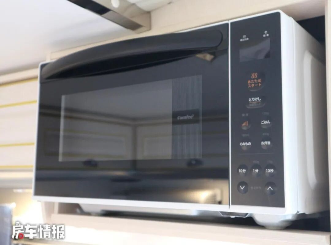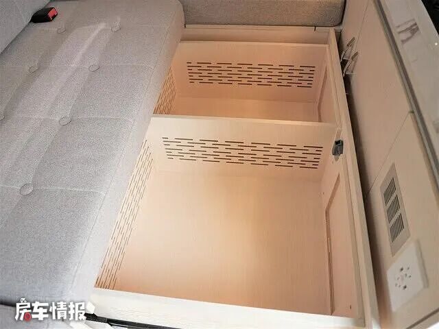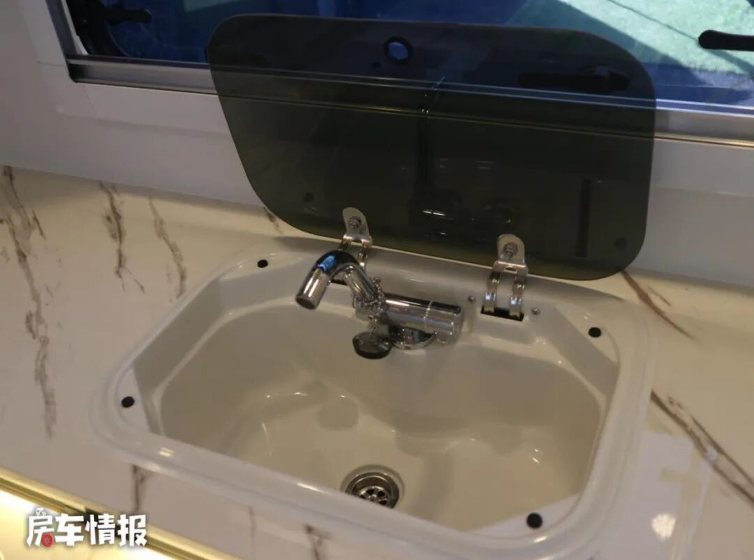 车内提供了一个尺寸挺大的厨房区域,这里提供了洗菜池、微波炉、冰箱等基础设备,搭配车内的24升清水箱,日常洗菜做饭都能轻松解决。