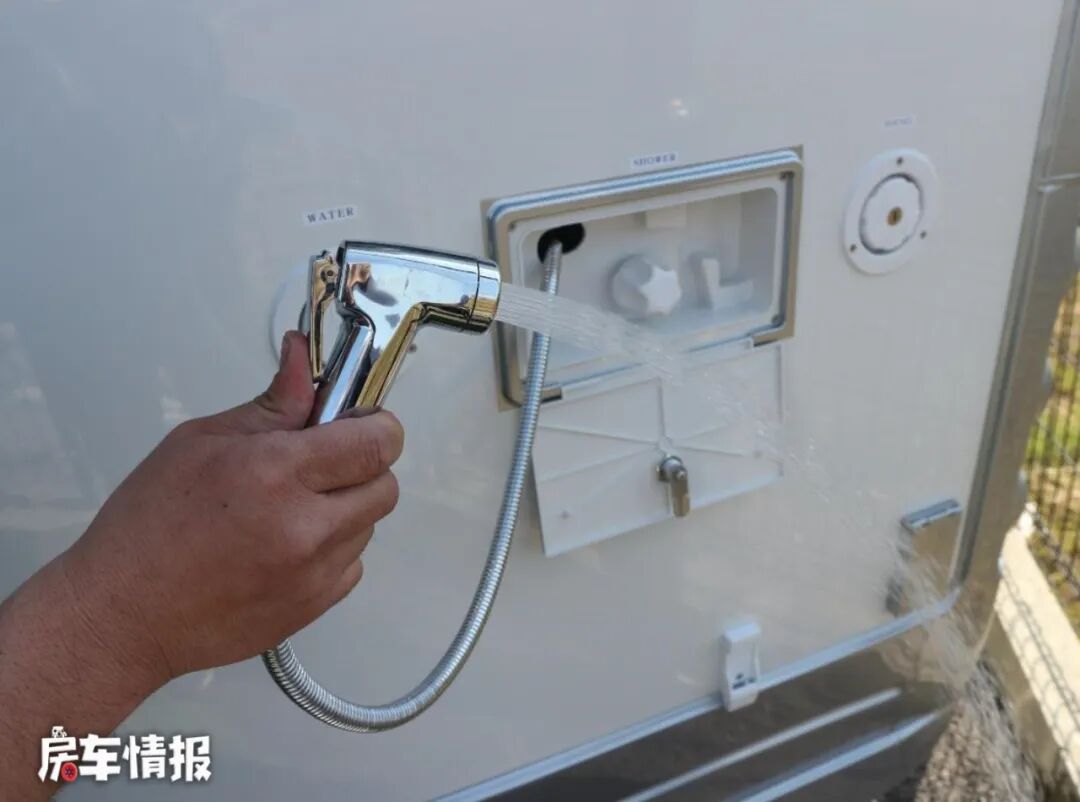别看尺寸不大,外部的功能设备还挺齐全,提供了一个外置淋雨花洒,可以在车外洗菜或者冲洗脚上的泥沙,手动遮阳棚也可以在烈日下搭建一个户外休息区。