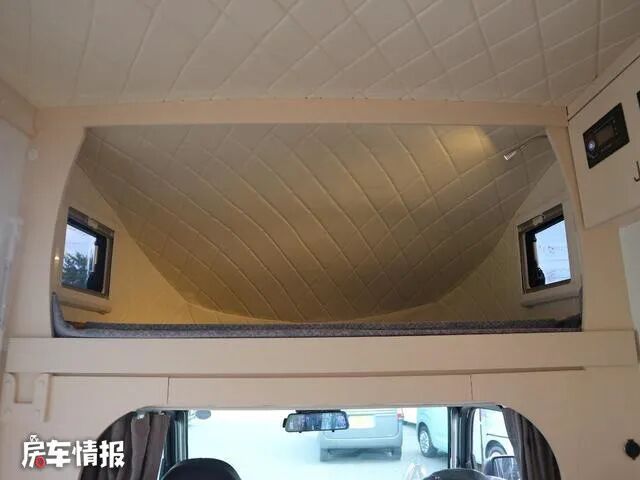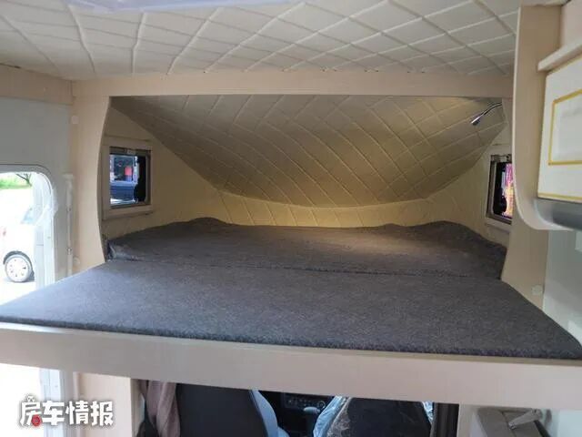 夜晚的时候,这款车内一共提供了两张双人床,第一张是驾驶室顶部的额头床,常规状态下额头床的尺寸为1500*1150毫米,床板可向外抽拉,打开以后尺寸拓展为1500*1750毫米,这样的尺寸真心很大了~