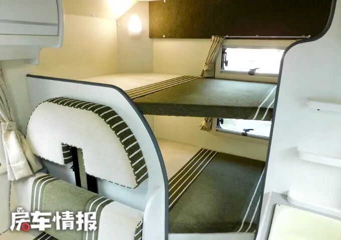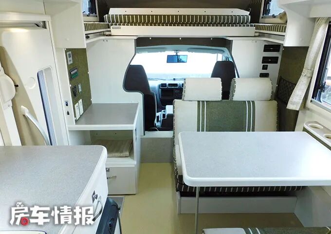 接下来我们来说说内部生活区域设施。沙发休息区有双人对卡座沙发,可以同时坐下四个人。中间有一张桌子,有固定支架,这样房车在行驶过程中桌子并不会出现东倒西歪的现象。并且沙发是可以折叠的哦,叠下来就变成了一张单人床,便于休息使用。