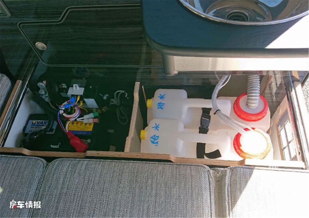 水电方面,房车采用70Ah副电池,和发动机舱的启动主电池分开供电,实现了动力和生活用电隔离,有效的保证了在野外用车时,不会因电瓶亏电导致的无法启动发动机。水路方面,净水箱/污水箱都是10L。