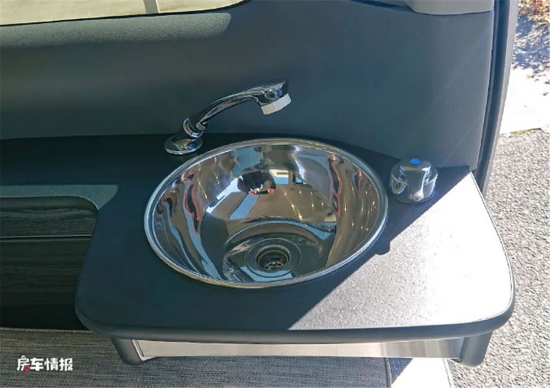 这款房车采用进水和排水水箱相等容积的设计,区别于国内房车的水箱一般都是净水箱容积远远大于污水箱的现实。这样的设计是很容易理解的,用多少水/排多少水,可见国外设计水路方面考虑到实际应用。