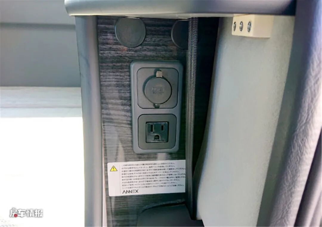 在车内还配备了!DC12V电源接口+AC交流电源插座,一些常见的家用电器都可以使用,各种电子设备的充电更是不在话下。由于这款房车不带逆变器,电源插座要在驻车时,已连接上外电时,才能正常使用哦。