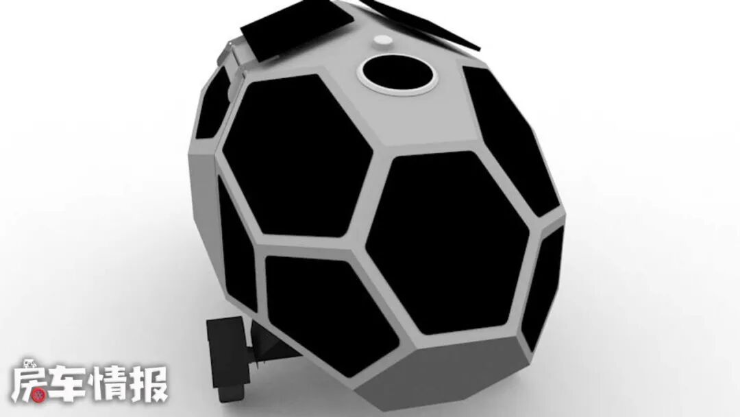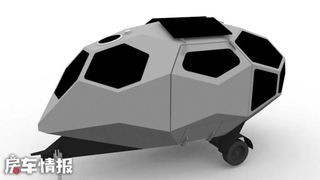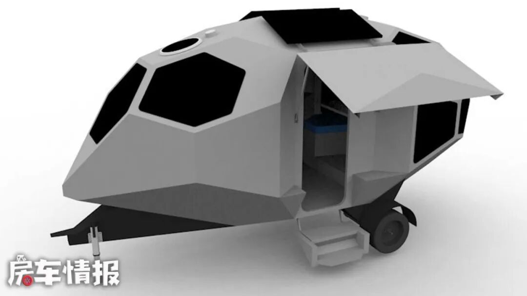 车身外部采用上掀门,由于门的尺寸还挺长的,打开之后,车门其实就可以相当于一个遮阳棚来使用了。外部还配有户外照明灯,上车踏步,车顶上还安装了太阳能电池板。当然车身外部最醒目的还是多个大小不一的五边形大窗户了,这让居住者在里面可以看到更加广阔的景色。