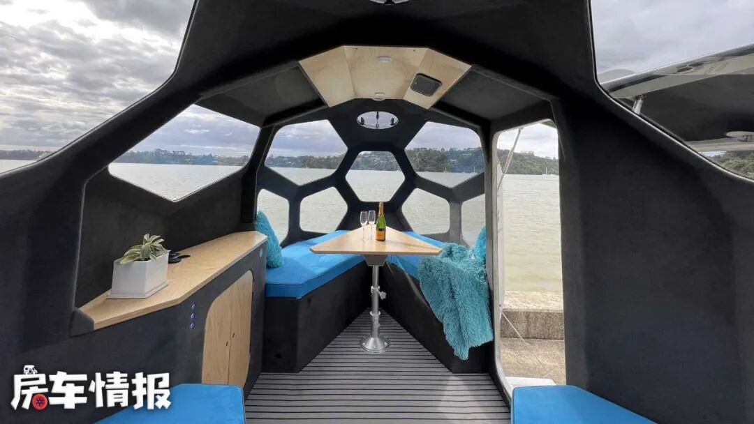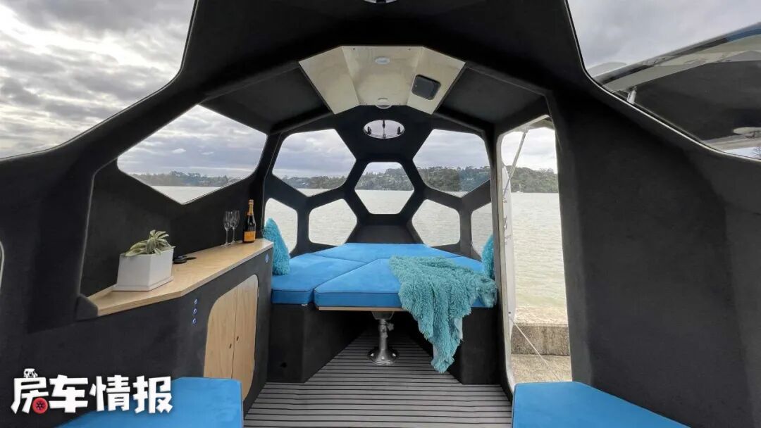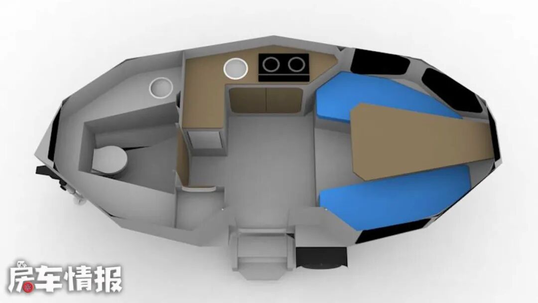 一走进车内,我们就可以看到一个小厨房了。配有燃气灶和水槽以及橱柜。车头独立卫生间。车尾会客区域,V字型沙发座椅,中间三角型餐桌,夜晚的时候,可以将餐桌降下,这里就可以形成一张不规则的双人床来使用了。另外,大面积的大小不一的五边形车窗,让车内变得无比的通透明亮,想象一下,躺在床上便可通过这极具科幻感的五边形车窗看到外面的璀璨星河。是不是有种置身于外太空的感觉啊。
