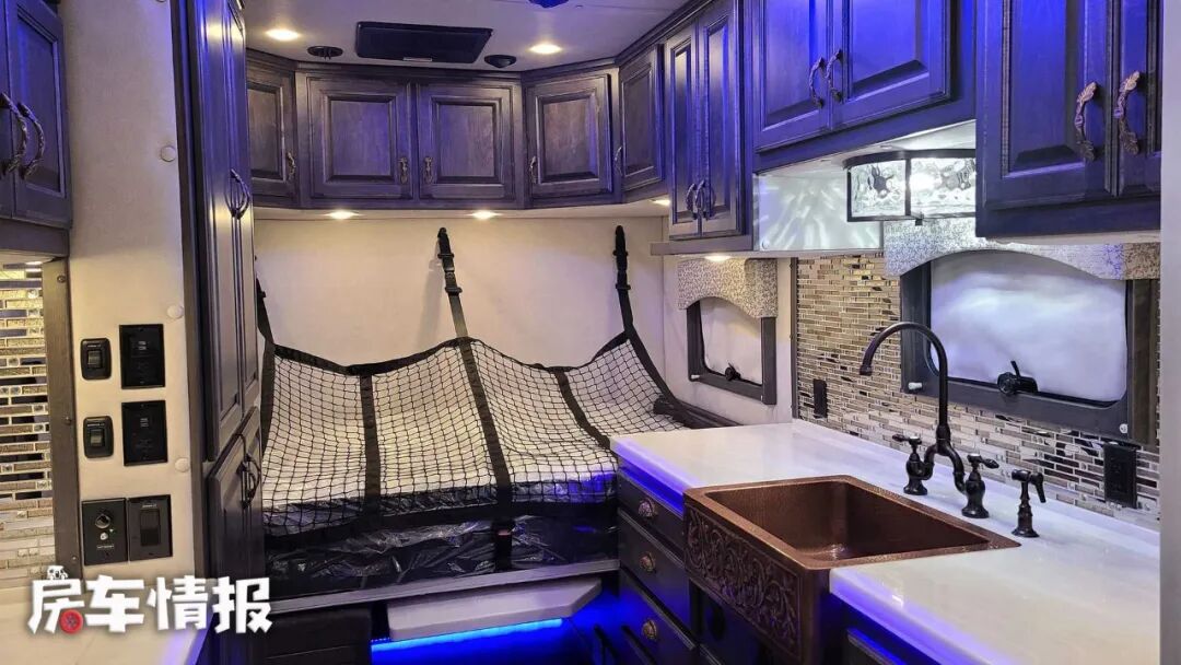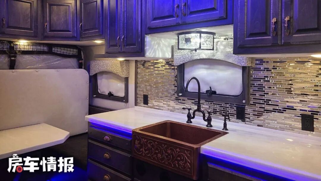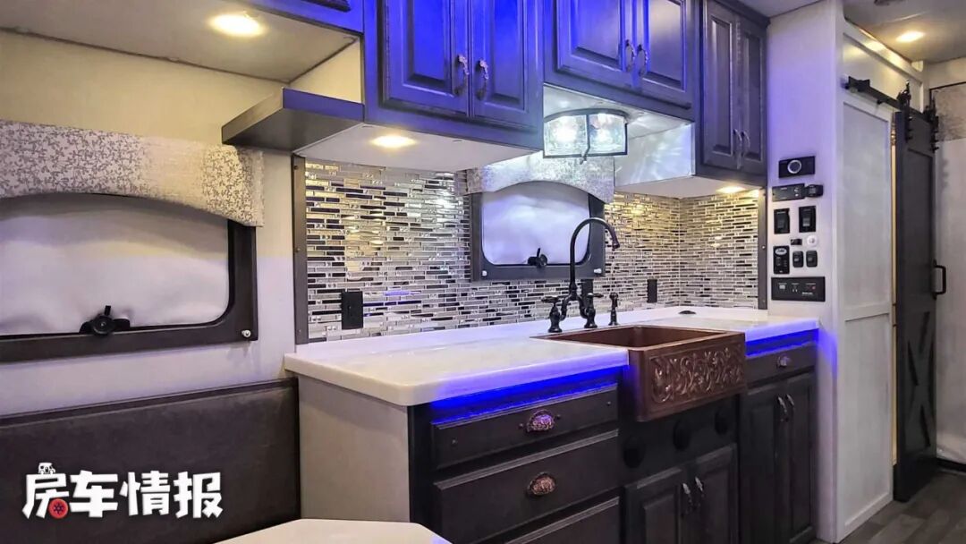 值得一提的是整个车内储物空间非常充足,上方一圈的吊柜,厨房区域还有橱柜,对面大衣柜等,均为深色的木纹饰板,工艺精湛,做工考究。厨房区域身后的料理台面配有延伸小桌板,可以扩充更大的操作台面。