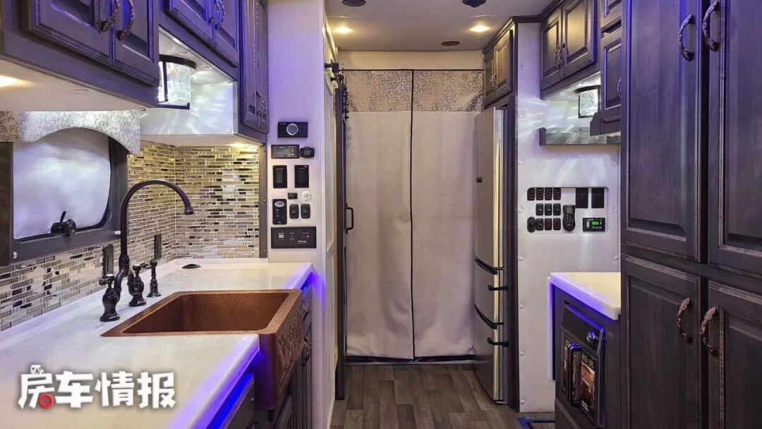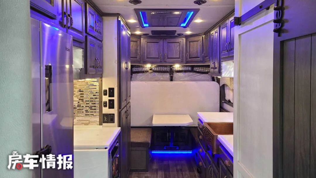 车内还配有一台空间很大的冰箱,可以放下更多的美食了。这台车采用后上门的布局,车身尾部还有一扇通往平板拖车的乘客门,所以我们可以看到这台车有两扇门。