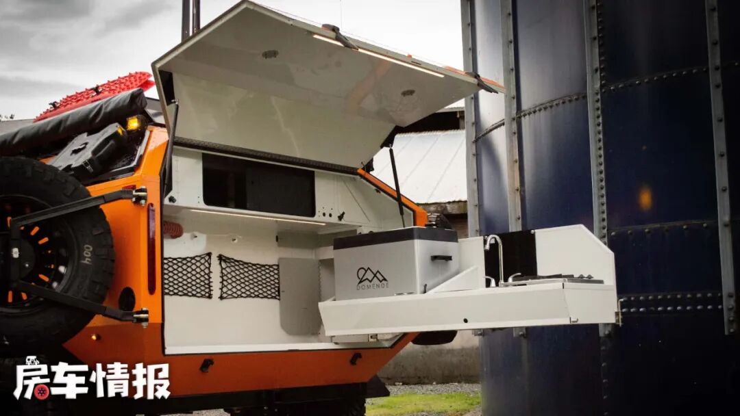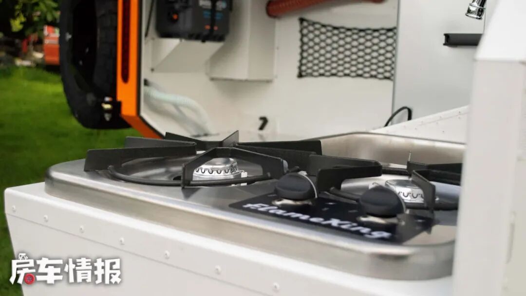 车身尾部,打开上掀门就是防摇摆式厨房区域了,配有双眼燃气灶,洗菜池。如果你想要在户外休息放松身心,也可以自己加装遮阳棚。