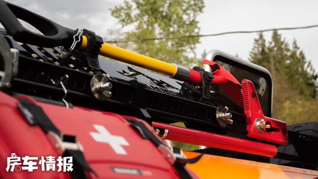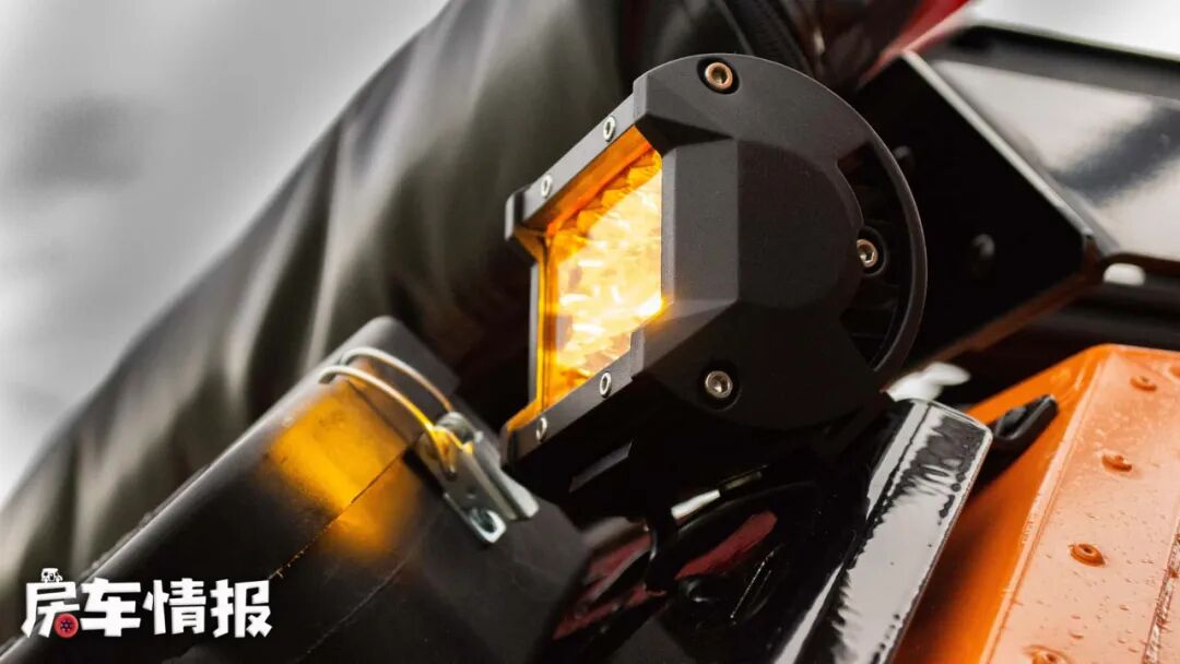 在伸缩杆上还安装了夜视摄像系统,可以360度观察露营车周围的情况,如果遇到野兽或是坏蛋试图接近你,只需按一下按钮,防熊喷雾的防御系统就可以启动,大面积破坏露营车周围的空气,让一切生物无法靠近。