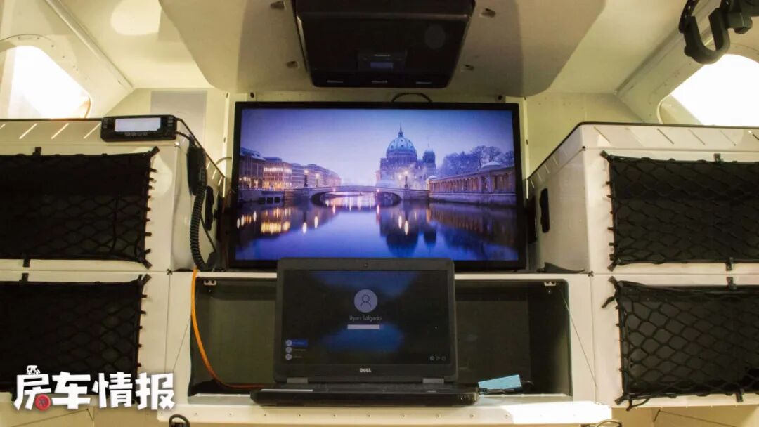 车辆内部就比较简单了,毕竟空间有限。可供大概两个人睡卧使用,配有一台32寸电视和空调。