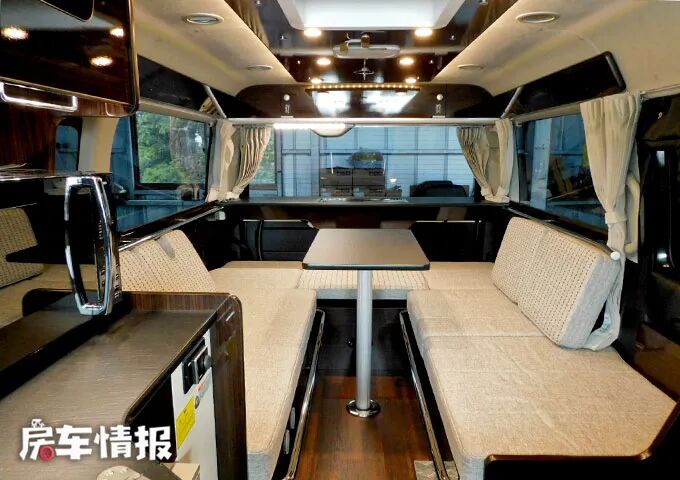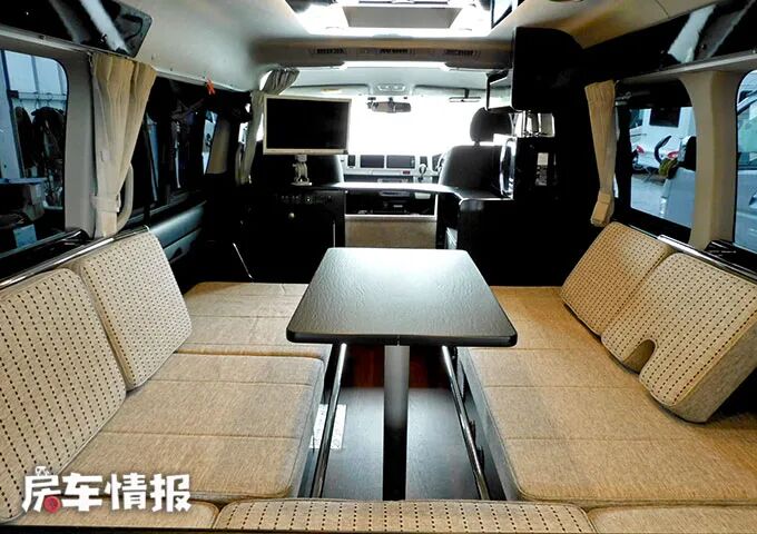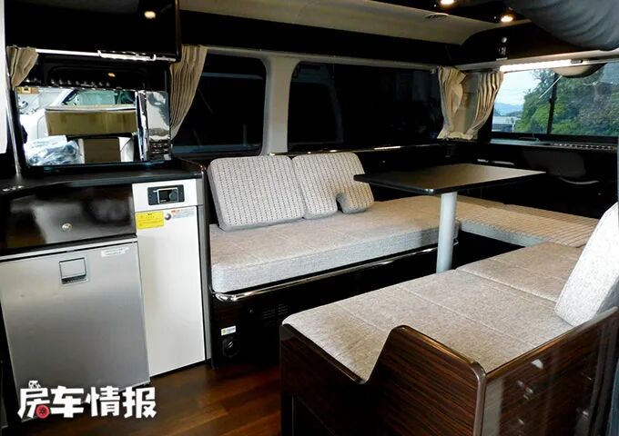 后方的生活空间,十分的温馨就像自家的客厅一样,采用的是环形沙发会客区域,中间可拆卸餐桌,在拼床时,将沙发靠背和沙发垫全部拼接,整个后方的生活空间就会变成一张大床来使用了。