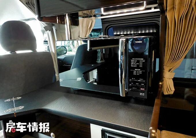 驾驶室身后就是组合柜,所以这台车是不能从后方的生活空间,直接走进驾驶室的,被组合柜隔开了。柜子上面摆放了一台19英寸电视,微波炉,下方一个49L小冰箱,这台车给大家配的是先锋音频,车顶还有双向换气扇,为车内更换新鲜空气。
