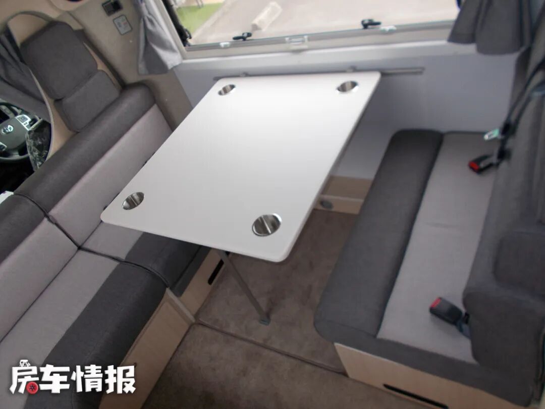 四个人围坐在一起时,还可以边聊天边喝个冷饮,在行车的时候可以放到餐桌上的杯槽里,以防止饮料洒落出来。这里的餐桌也是可以升降的,夜晚降下餐桌,将卡座床垫靠背全部拼接在一起,就可得到一张双人床了。顶部这台车还给大家配备了家用空调。