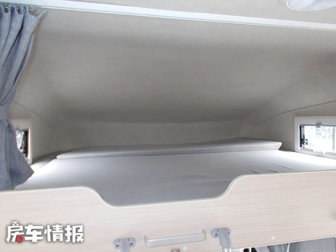 驾驶室上方是额头床,这个区域与国内C型房车一样,两侧外推窗通风采光,配备上床爬梯,隐私帘等。尺寸方面可以相拥而眠两个人。