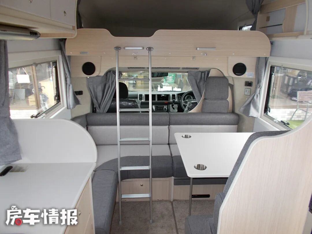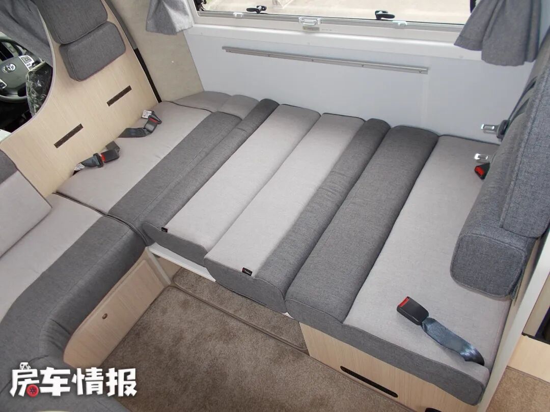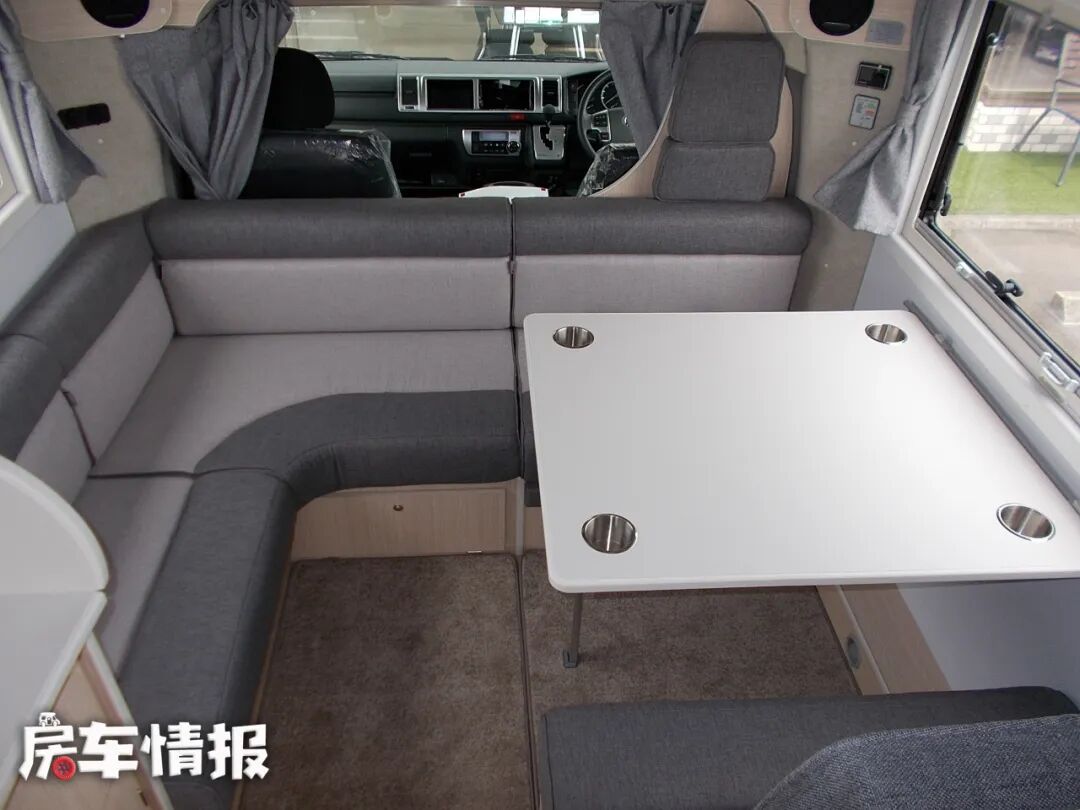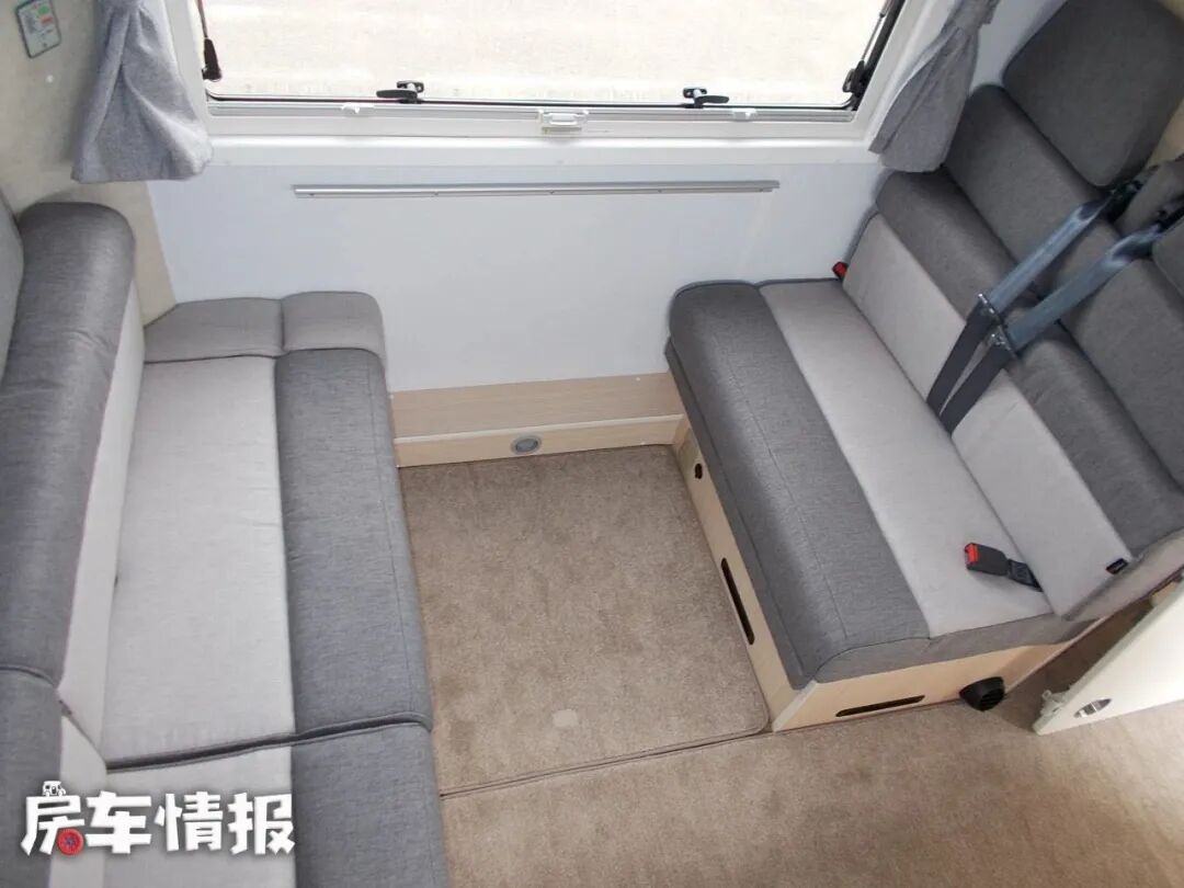 来看一下中间的会客区域,车子虽然小,但客厅感觉还是很宽敞明亮的,环形会客区域,可以乘坐4个人,一侧L型卡座沙发,另一侧单排沙发。与国内L型卡座沙发不同,他是在车身前方做的横向的L型沙发,这样虽然在一定程度上可以节省空间,但是,反向背靠驾驶室乘坐,可能会让乘坐者晕车,同时也没有办法让驾驶室和后方生活空间贯通,出入驾驶室还要绕到车外,比较麻烦。