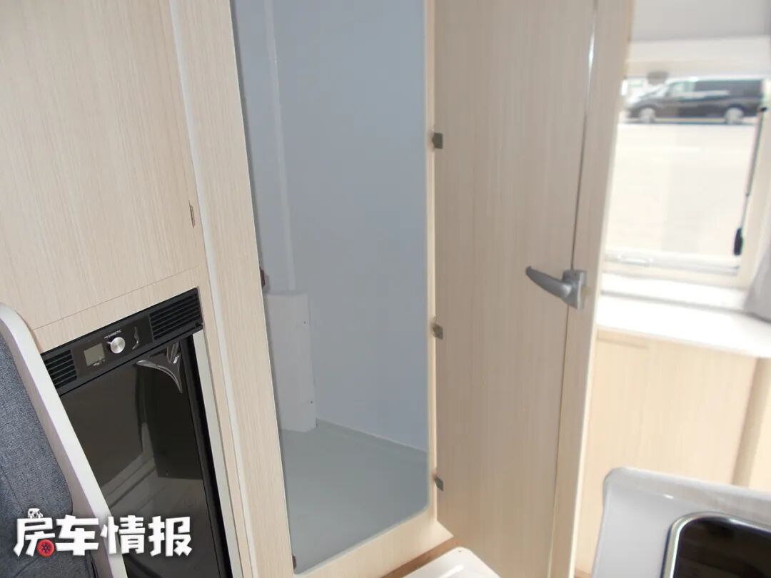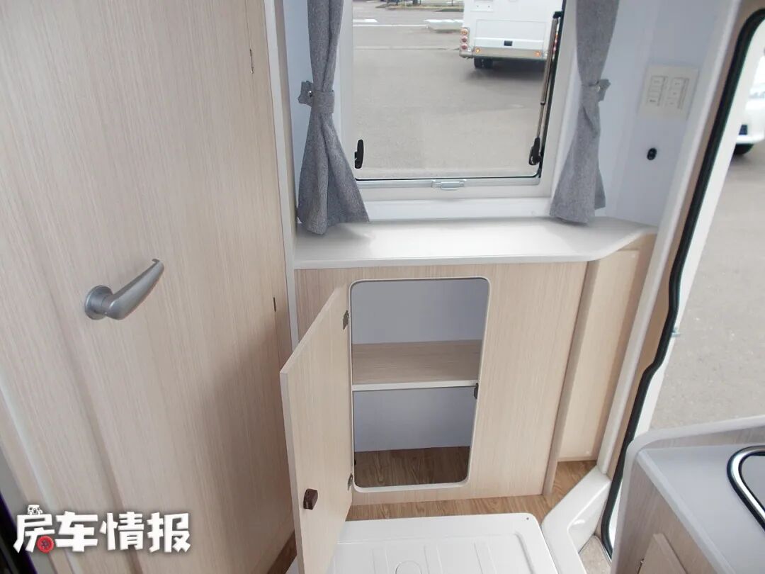 这台车采用后上门的布局,门上有两个置物格,可以放杂志,书,或者钥匙等。来到车内看一下,跟国内C型房车的布局都不一样。确实有一种耳目一新的感觉。车内都是以浅木色为主要色调,看起既温馨有贴近自然。