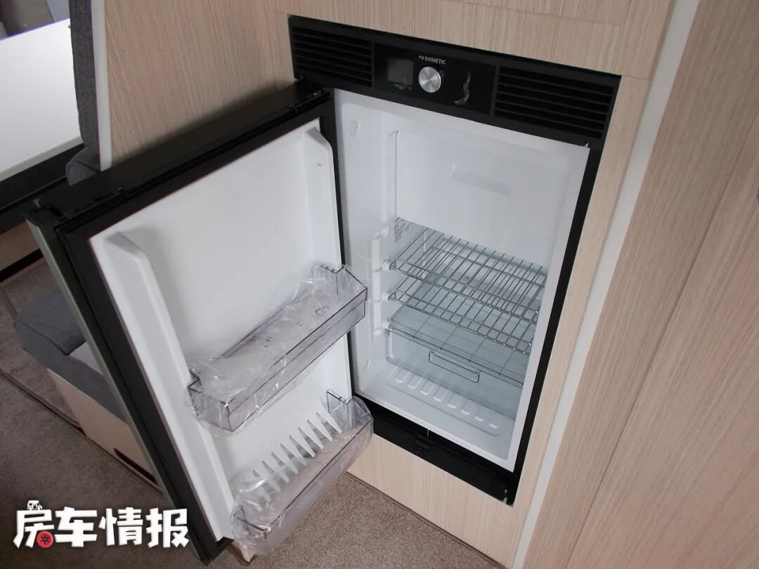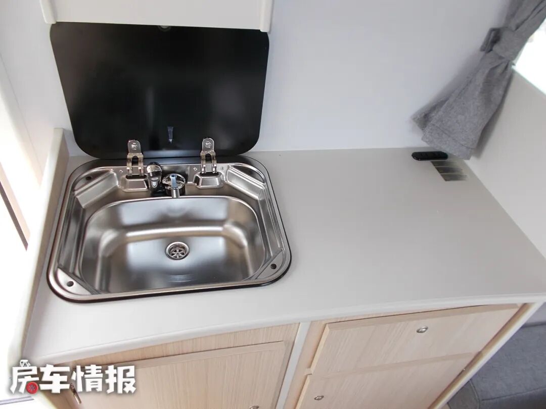 来看一下厨房区域,上方吊柜,与我们国内常见的比较方正的吊柜不同,这个吊柜柜门处采用内凹圆弧型的设计。其中一个吊柜内还放置着微波炉。料理台上配有带盖板的洗菜池,下方全部都是橱柜,可以放碗筷盘子等。身后还有一台房车专用冰箱。头顶双向换气扇,并带有圆形灯光,夜晚可以照明。