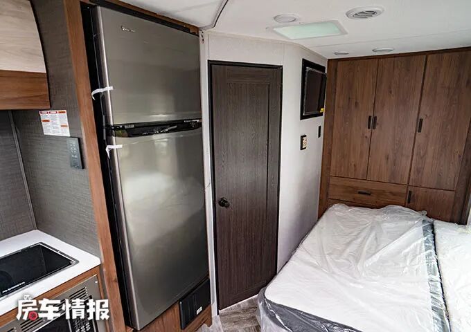 拓展打开之后,后排床垫打开,展开的这张大床,小编目测以国内的标准来看,就像是一张双人床加一张单人床那么大。不过照美国人的大块头身材来看,这张大床睡两个美国壮汉也是绰绰有余的。睡卧区域两侧墙壁上都有侧拉窗,行车时也可以打开通风。头顶还配有两个阅读灯。大床对面的墙壁上还有一块28英寸的液晶电视,躺在床上就可以观看精彩的节目喽。