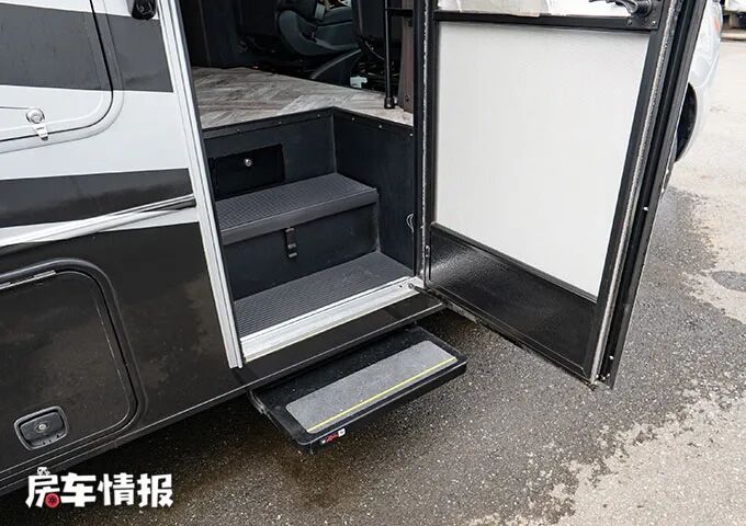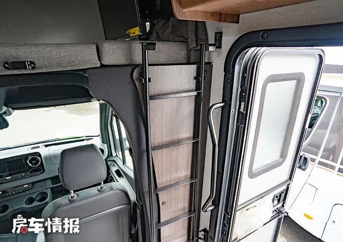 这辆车是左侧单拓展房车,拓展之后,内部活动空间可是相当的大,前上门的布局,乘客门处还配有上车扶手,老人小孩上下车的时候可以借一下力,更加方便。脚下还配有电动一级踏步。车尾处配有车顶爬梯,可以爬到车顶仰望星空。