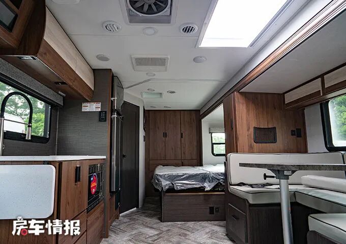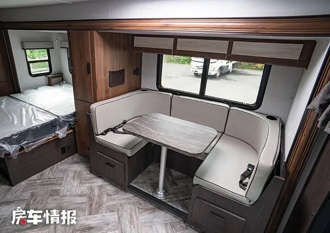 客厅区域,将拓展打开,哇塞中间的过道空间真的是相当宽敞了。在国内的房车可是看不到这么大的客厅。这台车配备的是C型卡座沙发,这个在国内房车里基本看不到,这样的沙发座就像是餐厅座椅一样,沙发垫也很厚实,乘坐感觉比较舒适。