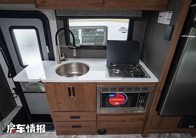 厨房区域,白色的料理台面,干净整洁,如果觉得空间小,旁边还有一个延伸小桌板,打开之后你会发现延伸桌板采用了和料理台面同色的设计,而且,不锈钢洗菜池的盖板也是同一颜色,白色,非常的统一。这里配备了一个高脚水龙头,放高一点的水壶接水也能放的下。厨房这里给大家配备的是双眼燃气灶。下方微波炉以及放置碗筷和锅具的储物抽屉和橱柜。冰箱上方冷冻下方冷藏。